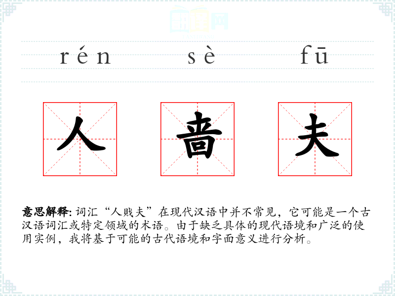 词汇“人戝夫”在现代汉语中并不常见,它可能是一个古汉语词汇或特定领域的术语。由于缺乏具体的现代语境和广泛的使用实例,我将基于可能的古代语境和字面意义进行分析。
