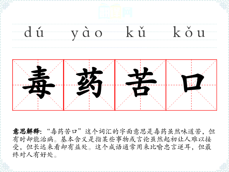 “毒药苦口”这个词汇的字面意思是毒药虽然味道苦,但有时却能治病。基本含义是指某些事物或言论虽然起初让人难以接受,但长远来看却有益处。这个成语通常用来比喻忠言逆耳,但最终对人有好处。