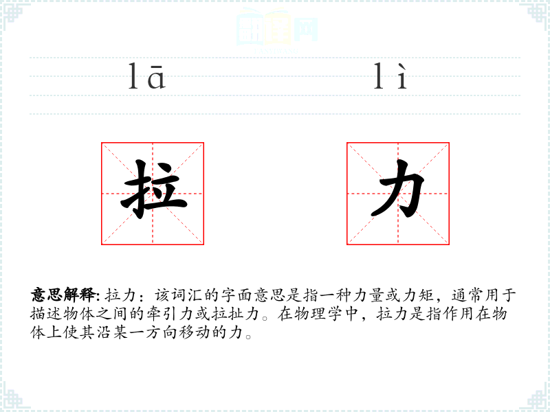拉力:该词汇的字面意思是指一种力量或力矩,通常用于描述物体之间的牵引力或拉扯力。在物理学中,拉力是指作用在物体上使其沿某一方向移动的力。