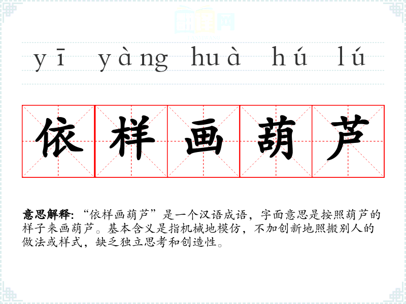 “依样画葫芦”是一个汉语成语,字面意思是按照葫芦的样子来画葫芦。基本含义是指机械地模仿,不加创新地照搬别人的做法或样式,缺乏独立思考和创造性。