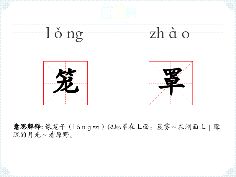 像笼子(lónɡ•zi)似地罩在上面:晨雾~在湖面上|朦胧的月光~着原野。