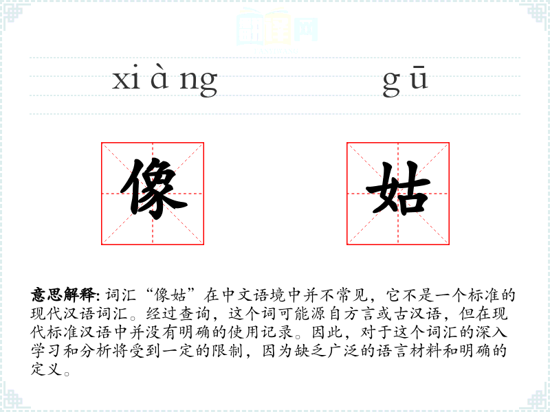 词汇“像姑”在中文语境中并不常见,它不是一个标准的现代汉语词汇。经过查询,这个词可能源自方言或古汉语,但在现代标准汉语中并没有明确的使用记录。因此,对于这个词汇的深入学习和分析将受到一定的限制,因为缺乏广泛的语言材料和明确的定义。