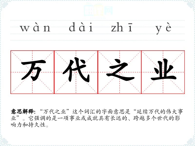 “万代之业”这个词汇的字面意思是“延续万代的伟大事业”。它强调的是一项事业或成就具有长远的、跨越多个世代的影响力和持久性。