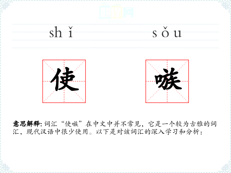 词汇“使嗾”在中文中并不常见,它是一个较为古雅的词汇,现代汉语中很少使用。以下是对该词汇的深入学*和分析: