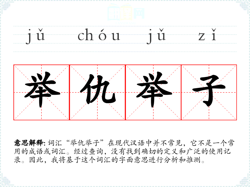 词汇“举仇举子”在现代汉语中并不常见,它不是一个常用的成语或词汇。经过查询,没有找到确切的定义和广泛的使用记录。因此,我将基于这个词汇的字面意思进行分析和推测。