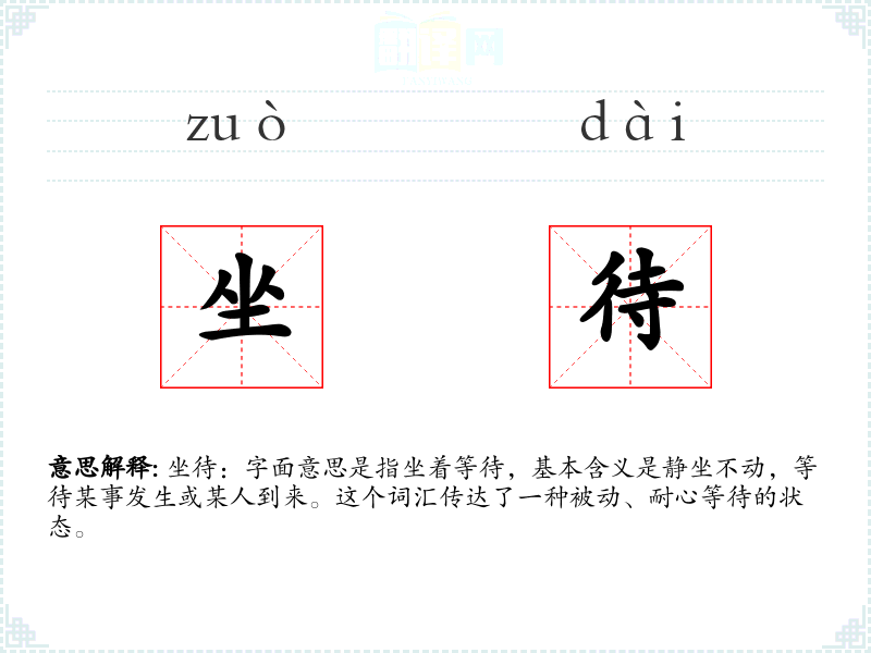 坐待:字面意思是指坐着等待,基本含义是静坐不动,等待某事发生或某人到来。这个词汇传达了一种被动、耐心等待的状态。