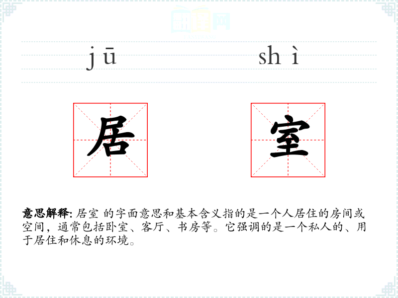 在英语中,“居室”可以对应为“living space”或“living room”,虽然在英语中更常用“room”来指代具体的房间。