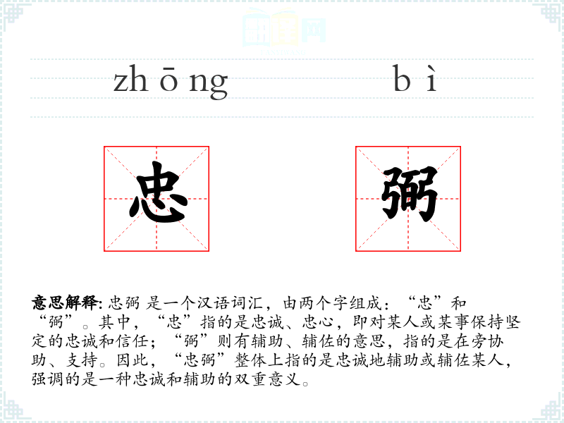 “忠”字最早见于甲骨文,原意为内心坚定,后引申为忠诚。“弼”字则较晚出现,原意为矫正弓弩的工具,后引申为辅助、矫正。两个字结合,形成了“忠弼”这一复合词,强调的是忠诚与辅助的结合。