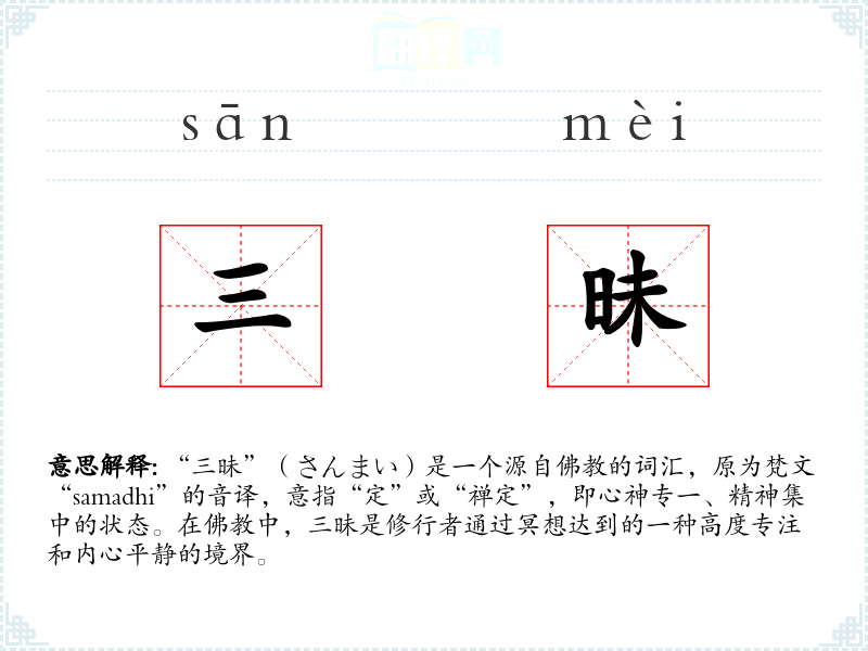 “三昧”(さんまい)是一个源自的词汇,原为梵文“samadhi”的音译,意指“定”或“禅定”,即心神专一、精神集中的状态。在中,三昧是修行者通过冥想达到的一种高度专注和内心平静的境界。