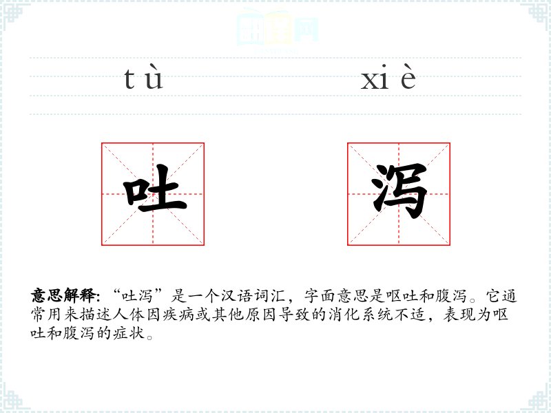 - 反义词:无(由于“吐泻”描述的是一种症状,通常没有直接的反义词)