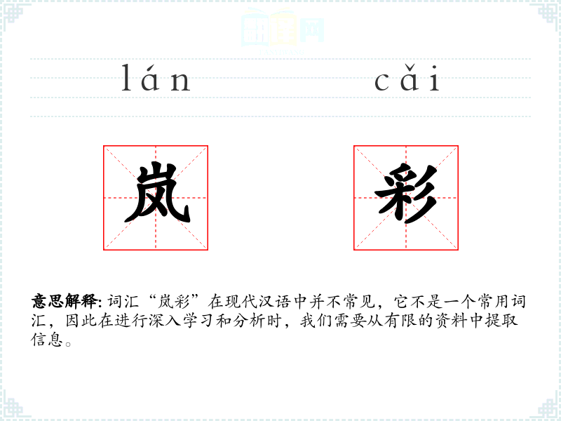 - 反义词:清晰、明朗(这些词汇与“岚彩”所表达的朦胧美感相对立)
