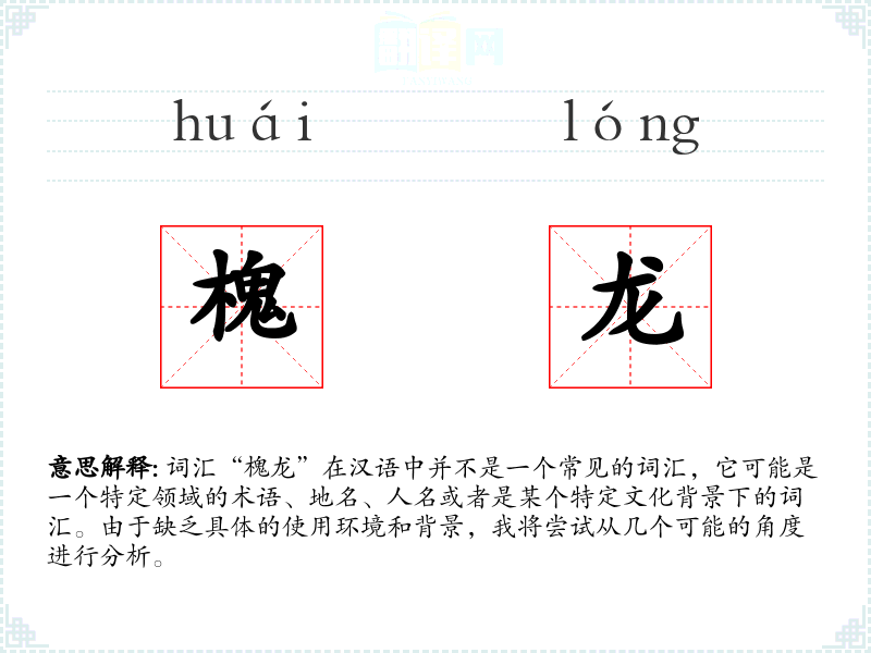 如果“槐龙”是一个地名,它可能指的是某个地方的名称,可能是因为该地有槐树或者与龙有关的历史传说。如果是一个人名,它可能是一个具有特定文化背景的名字,结合了自然元素和神话元素。