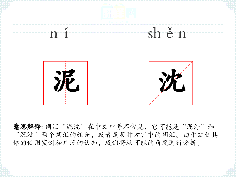 - 由于“泥沈”不是一个标准词汇,其词源和演变不详。