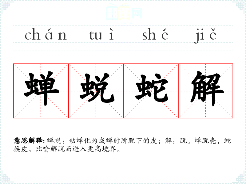 蝉蜕:幼蝉化为成蝉时所脱下的皮;解:脱。蝉脱壳,蛇换皮。比喻解脱而进入更高境界。