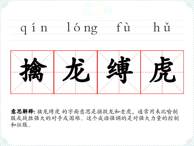 擒龙缚虎 的字面意思是捕捉龙和**,通常用来比喻制服或战胜强大的对手或困难。这个成语强调的是对强大力量的控制和征服。