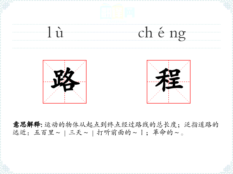 运动的物体从起点到终点经过路线的总长度;泛指道路的远近:五百里~|三天~|打听前面的~丨;革命的~。