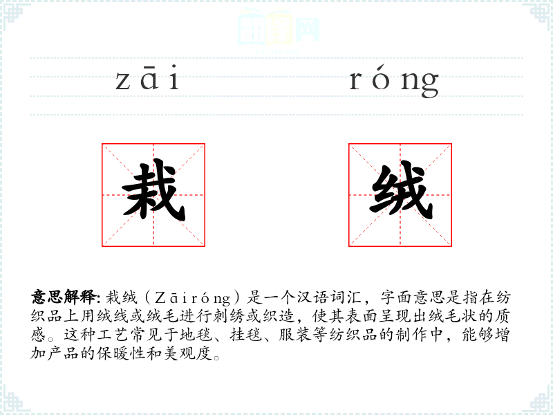 栽绒(Zāi róng)是一个汉语词汇,字面意思是指在纺织品上用绒线或绒毛进行刺绣或织造,使其表面呈现出绒毛状的质感。这种工艺常见于地毯、挂毯、服装等纺织品的制作中,能够增加产品的保暖性和美观度。