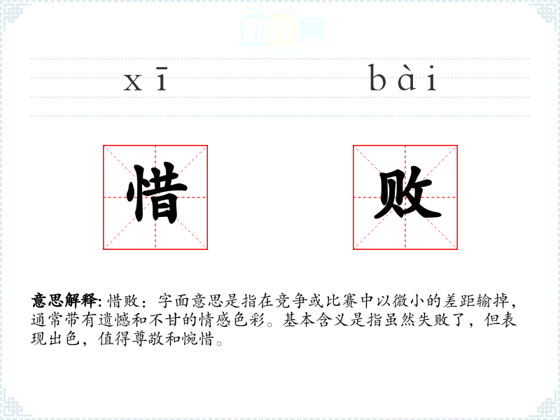 惜败:字面意思是指在竞争或比赛中以微小的差距输掉,通常带有遗憾和不甘的情感色彩。基本含义是指虽然失败了,但表现出色,值得尊敬和惋惜。