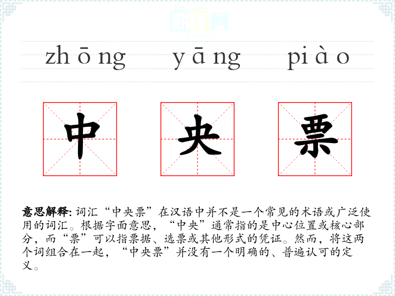 词汇“中央票”在汉语中并不是一个常见的术语或广泛使用的词汇。根据字面意思,“中央”通常指的是中心位置或核心部分,而“票”可以指票据、选票或其他形式的凭证。然而,将这两个词组合在一起,“中央票”并没有一个明确的、普遍认可的定义。