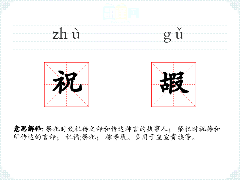 祭祀时致祝祷之辞和传达神言的执事人; 祭祀时祝祷和所传达的言辞; 祝福;祭祀; 棕寿辰。多用于皇室贵族等。