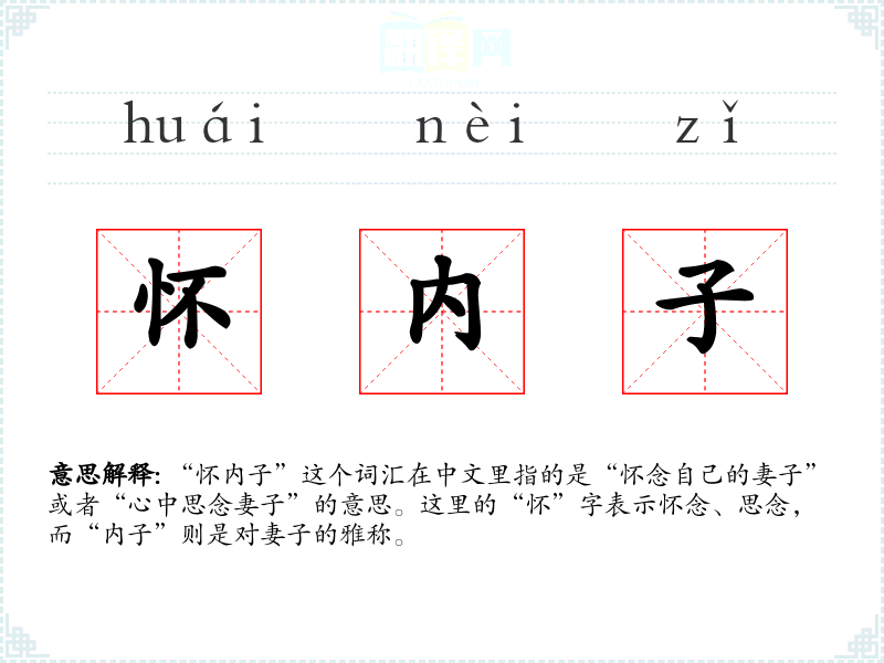 “怀内子”这个词汇在中文里指的是“怀念自己的妻子”或者“心中思念妻子”的意思。这里的“怀”字表示怀念、思念,而“内子”则是对妻子的雅称。