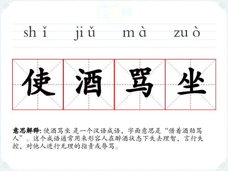 使酒骂坐 是一个汉语成语,字面意思是“借着酒劲骂人”。这个成语通常用来形容人在醉酒状态下失去理智,言行失控,对他人进行无理的指责或辱骂。