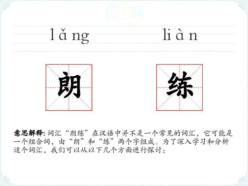 词汇“朗练”在汉语中并不是一个常见的词汇,它可能是一个组合词,由“朗”和“练”两个字组成。为了深入学习和分析这个词汇,我们可以从以下几个方面进行探讨: