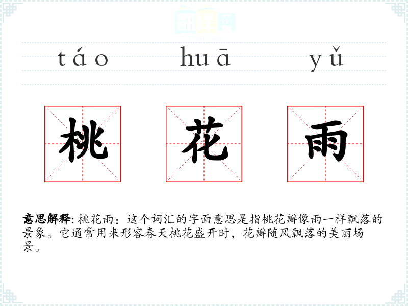 桃花雨:这个词汇的字面意思是指桃花瓣像雨一样飘落的景象。它通常用来形容春天桃花盛开时,花瓣随风飘落的美丽场景。
