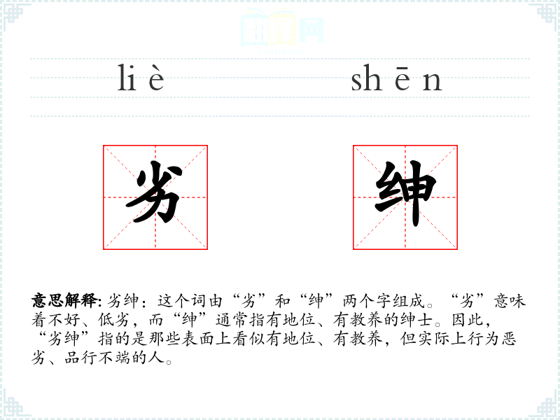 劣绅:这个词由“劣”和“绅”两个字组成。“劣”意味着不好、低劣,而“绅”通常指有地位、有教养的绅士。因此,“劣绅”指的是那些表面上看似有地位、有教养,但实际上行为恶劣、品行不端的人。
