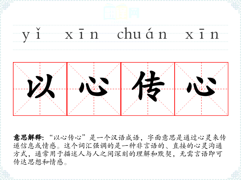 “以心传心”是一个汉语成语,字面意思是通过心灵来传递信息或情感。这个词汇强调的是一种非言语的、直接的心灵沟通方式,通常用于描述人与人之间深刻的理解和默契,无需言语即可传达思想和情感。