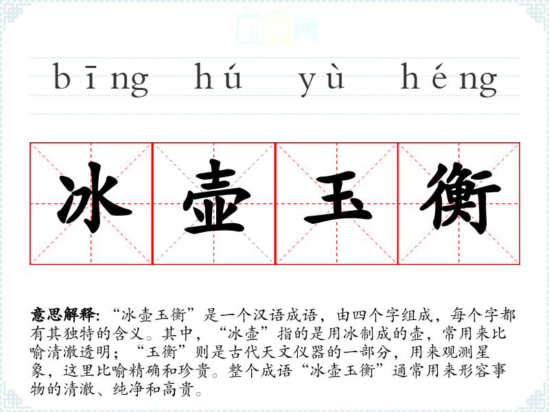 “冰壶”和“玉衡”都是古代汉语中的词汇。冰壶可能源自古代对冰的利用,而玉衡则与古代天文学和占星术有关。随着时间的推移,这两个词汇结合形成了成语“冰壶玉衡”,用来形容更加抽象的品质,如纯净和高贵。