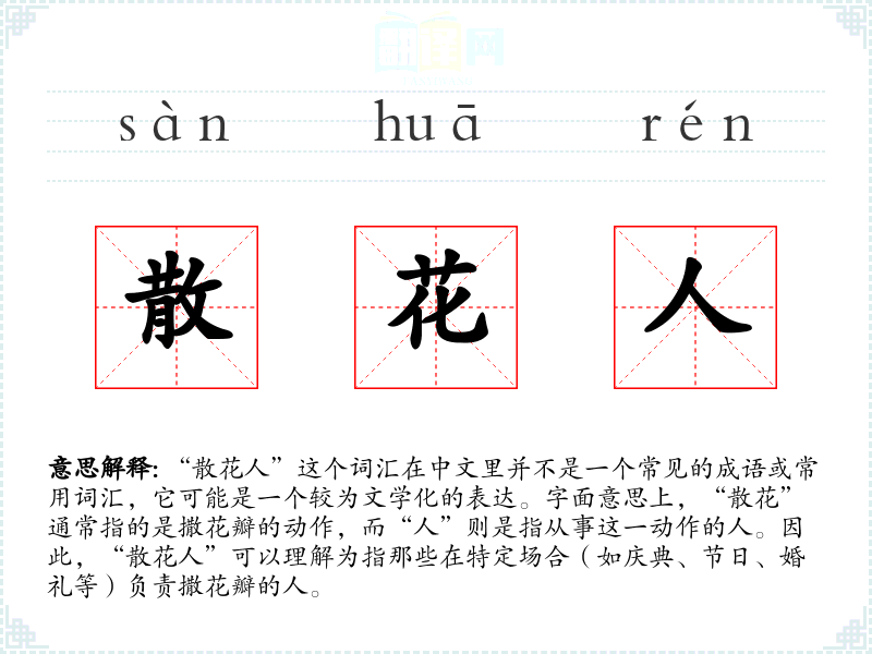 由于“散花人”不是一个常用词汇,其词源和演变不太明确。它可能是由“散花”和“人”两个词汇组合而成,用于描述一个特定的角色或行为。