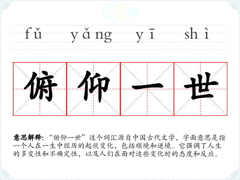 “俯仰一世”这个词汇源自**古代文学,字面意思是指一个人在一生中经历的起伏变化,包括顺境和逆境。它强调了人生的多变性和不确定性,以及人们在面对这些变化时的态度和反应。