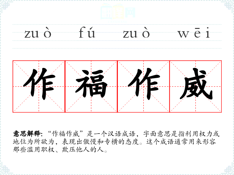 “作福作威”是一个汉语成语,字面意思是指利用权力或地位为所欲为,表现出傲慢和专横的态度。这个成语通常用来形容那些滥用职权、欺压他人的人。