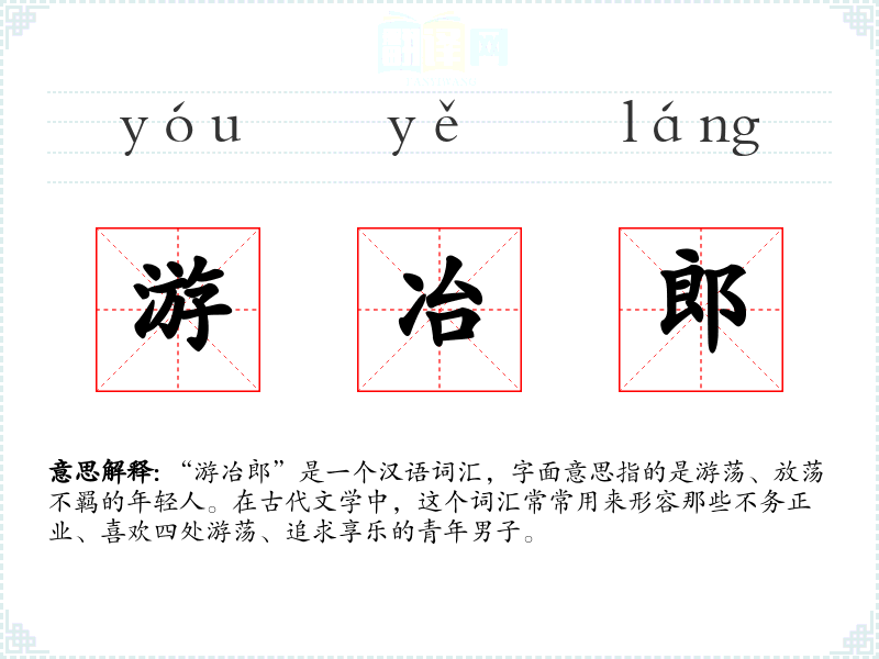 “游冶郎”是一个汉语词汇,字面意思指的是游荡、放荡不羁的年轻人。在古代文学中,这个词汇常常用来形容那些不务正业、喜欢四处游荡、追求享乐的青年男子。