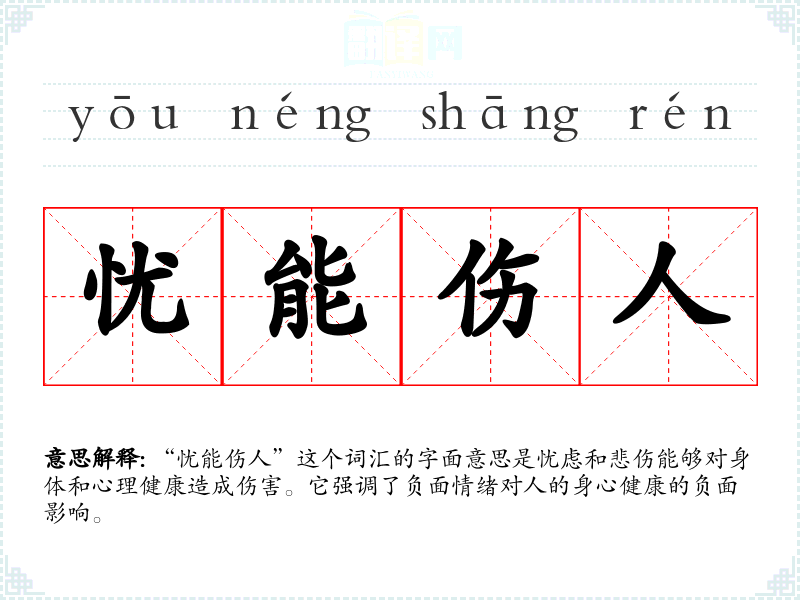 “忧能伤人”这个词汇的字面意思是忧虑和悲伤能够对身体和心理健康造成伤害。它强调了负面情绪对人的身心健康的负面影响。