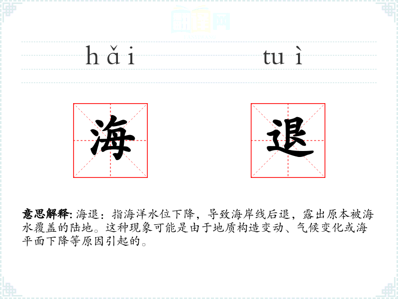 - 词源:“海退”一词由“海”和“退”组成,直接表达了海洋水位后退的意思。