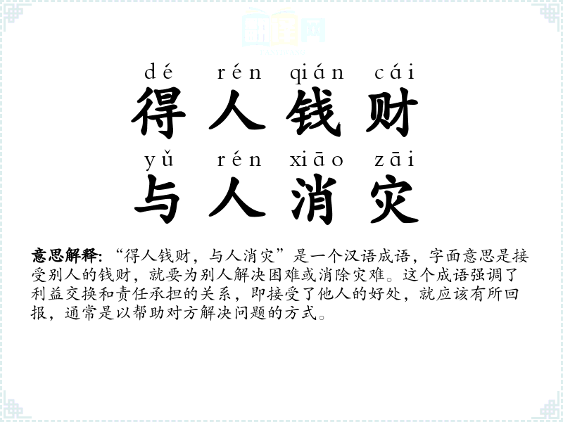 “得人钱财,与人消灾”是一个汉语成语,字面意思是接受别人的钱财,就要为别人解决困难或消除灾难。这个成语强调了利益交换和责任承担的关系,即接受了他人的好处,就应该有所回报,通常是以帮助对方解决问题的方式。