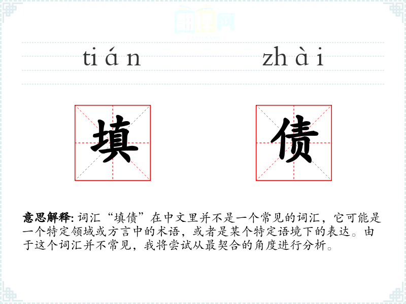 词汇“填债”在中文里并不是一个常见的词汇,它可能是一个特定领域或方言中的术语,或者是某个特定语境下的表达。由于这个词汇并不常见,我将尝试从最契合的角度进行分析。