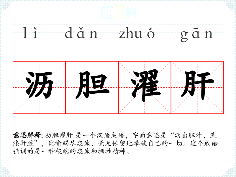 沥胆濯肝 这个成语在汉语中具有重要的文化意义,它不仅是对忠诚和牺牲精神的高度赞扬,也是对个人品德的一种期望。在语言学*和表达中,理解和运用这个成语可以帮助我们更好地传达对忠诚和奉献的尊重和敬意。