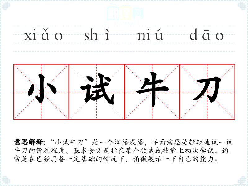 “小试牛刀”是一个汉语成语,字面意思是轻轻地试一试牛刀的锋利程度。基本含义是指在某个领域或技能上初次尝试,通常是在已经具备一定基础的情况下,稍微展示一下自己的能力。