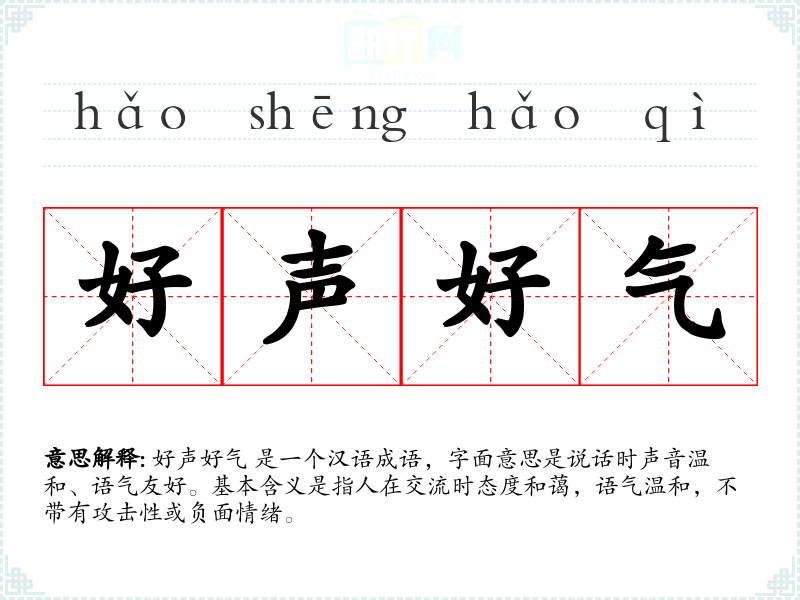 好声好气 是一个汉语成语,字面意思是说话时声音温和、语气友好。基本含义是指人在交流时态度和蔼,语气温和,不带有攻击性或负面情绪。
