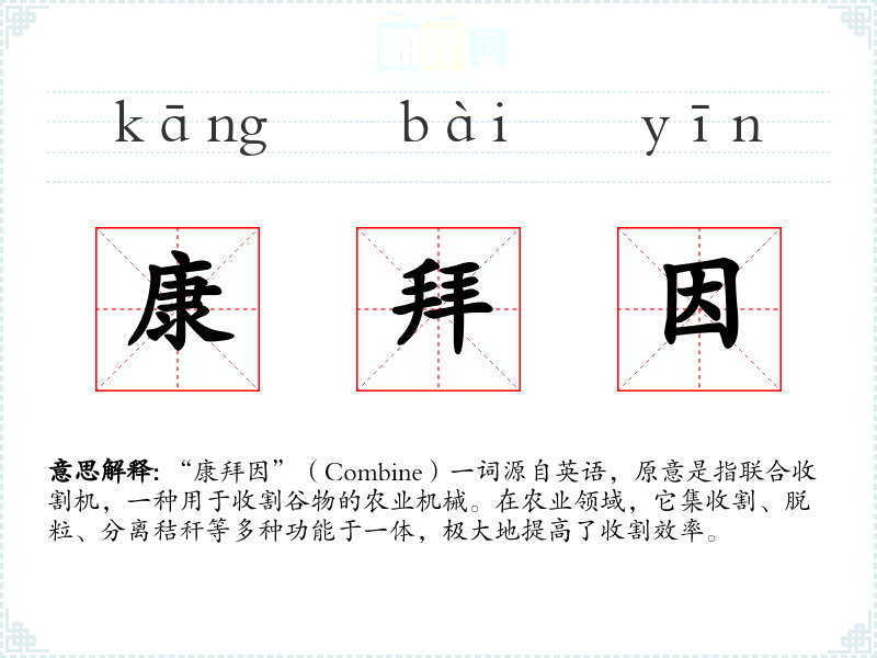 “康拜因”一词源自英语“combine”,最初是指联合或结合的意思。随着农业机械的发展,这个词逐渐特指联合收割机。在20世纪,随着农业机械化的普及,“康拜因”成为农业领域的一个重要词汇。