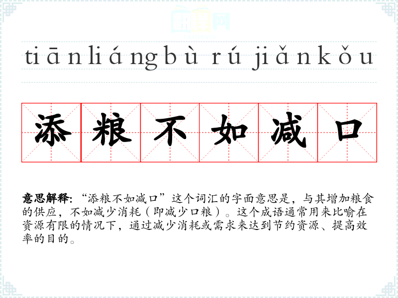 “添粮不如减口”这个词汇的字面意思是,与其增加粮食的供应,不如减少消耗(即减少口粮)。这个成语通常用来比喻在资源有限的情况下,通过减少消耗或需求来达到节约资源、提高效率的目的。