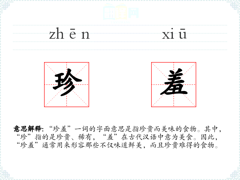 “珍羞”一词的字面意思是指珍贵而美味的食物。其中,“珍”指的是珍贵、稀有,“羞”在古代汉语中意为美食。因此,“珍羞”通常用来形容那些不仅味道鲜美,而且珍贵难得的食物。