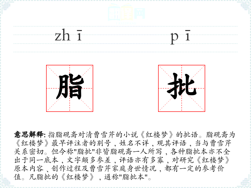 1.指脂砚斋对清曹雪芹的小说《红楼梦》的批语。脂砚斋为《红楼梦》最早评注者的别号﹐姓名不详﹐观其评语﹐当与曹雪芹关系密切。但今称"脂批"非皆脂砚斋一人所写﹐各种脂批本亦不全出于同一底本﹐文字颇多参差﹐评语亦有多寡﹐对研究《红楼梦》原本内容﹑创作过程及曹雪芹家庭身世情况﹐都有一定的参考价值。凡脂批的《红楼梦》﹐通称"脂批本"。