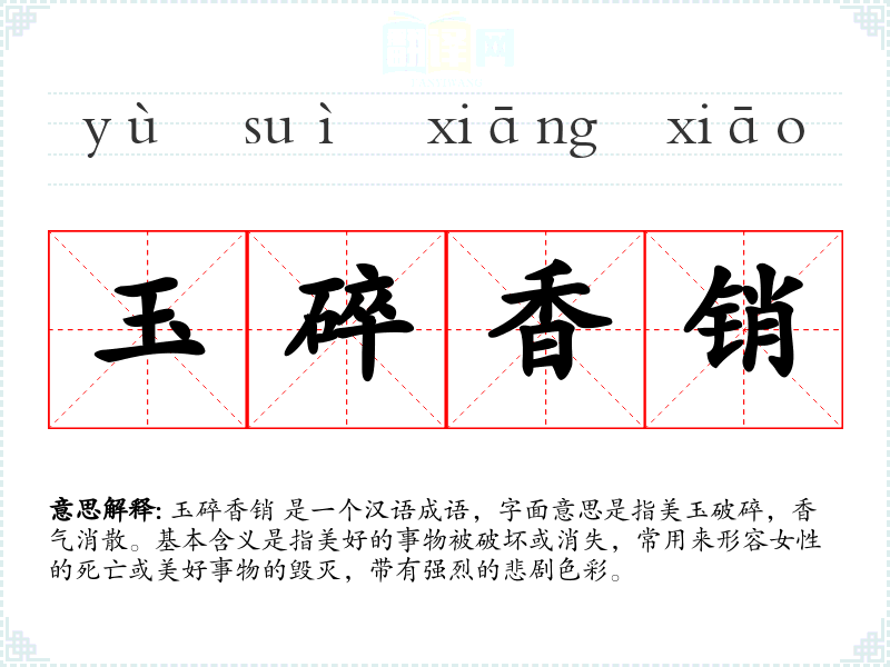 玉碎香销 是一个汉语成语,字面意思是指美玉破碎,香气消散。基本含义是指美好的事物被破坏或消失,常用来形容女性的死亡或美好事物的毁灭,带有强烈的悲剧色彩。