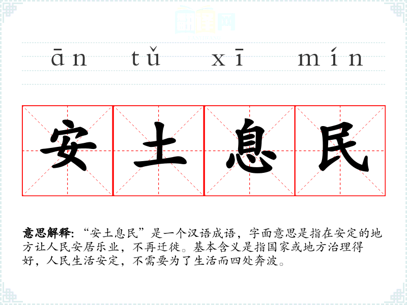 “安土息民”出自《左传·宣公十五年》:“安土重迁,黎民之性;骨肉相附,人情之所愿也。”后来逐渐演变成形容国家或地区安定,人民安居乐业的成语。
