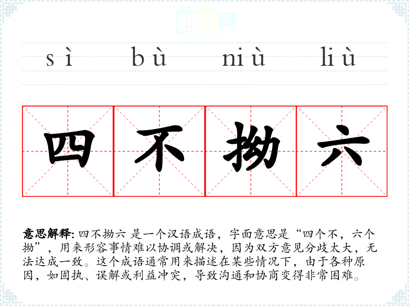 四不拗六 是一个汉语成语,字面意思是“四个不,六个拗”,用来形容事情难以协调或解决,因为双方意见分歧太大,无法达成一致。这个成语通常用来描述在某些情况下,由于各种原因,如固执、误解或利益冲突,导致沟通和协商变得非常困难。