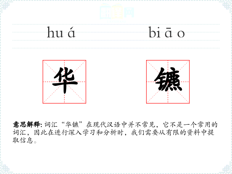 词汇“华镳”在现代汉语中并不常见,它不是一个常用的词汇,因此在进行深入学*和分析时,我们需要从有限的资料中提取信息。